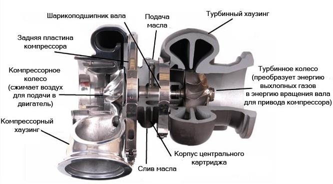 После отработки воздушно-топливной смеси (выгорания), она через выпускной коллектор уходит, где этот поток горячего воздуха под температурой до 1000 градусов попадает в турбину, вращая ее вал на другой стороне. Это позволяет повторить цикл сжатия и подать новую порцию воздуха обратно в цилиндры.